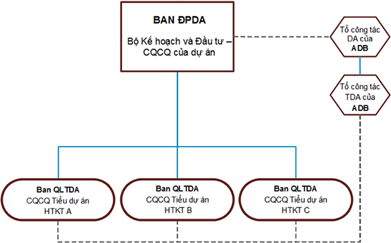 Ban Điều phối dự án (Ban ĐPDA): Ban ĐPDA được thành lập thuộc Vụ Kinh tế Đối ngoại, Bộ Kế hoạch và Đầu tư. Bộ Kế hoạch và Đầu tư đã bổ nhiệm Giám đốc, Phó giám đốc, Điều phối viên, Kế toán trưởng và cán bộ của Ban ĐPDA. Ban ĐPDA có trách nhiệm phối hợp và thực hiện dự án. Trách nhiệm của họ cũng bao gồm quản lý tài chính cho dự án, giám sát và đánh giá, tuân thủ chính sách bảo đảm chất lượng và an toàn chung của dự án, quản trị dự án, minh bạch và khung chống tham nhũng. Ban ĐPDA sẽ tổ chức đấu thầu để tuyển tư vấn trong nước và quốc tế cần thiết cho dự án và mở một tài khoản chỉ định cho dự án.